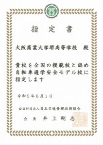 本校は全校生徒の約9割が自転車で通学しており、安全教育の一環として、平成25年度より自転車運転免許制というものを導入しています。入学後、 自転車利用に関する実技試験と学科試験を行い、 合格した生徒に対し、本校独自の「自転車運転免許証」 を交付しています。この教育活動に対し評価いただき、協会より認定いただいたものと考えております。