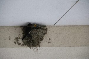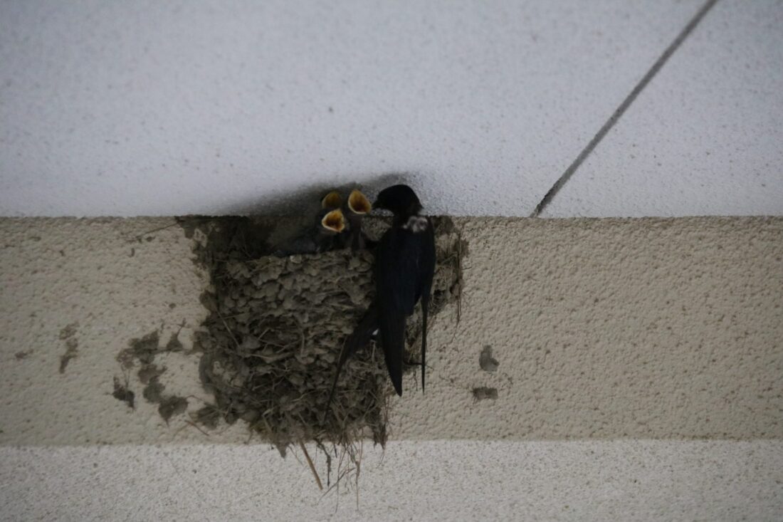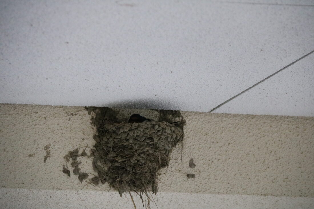 親鳥が卵を交代で温めている様子が伺えます。生徒もツバメの巣に気付い歓声を上げるとすごく警戒している様子です。