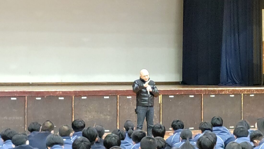 1月25日(木)2年生の総合探究の一環として薬物乱用防止教室を行いました。NPO法人びわこダルクの施設長である猪瀬健夫氏をお招きし、講演をして頂きました。びわこダルクとは、民間の薬物依存症回復施設で、猪瀬氏をはじめスタッフ全員が薬物経験者です。この施設では、様々な薬物依存症者の回復と成長のためのプログラムを実践されています。本日の講演で猪瀬氏は、薬物の怖さを2年生の生徒たちに伝えて頂くと同時に「薬物を初めて使おうかなと思うとき、その瞬間、君たちのその後の人生を全て捨てることになる。その勇気がありますか?」という言葉がとても印象的でした。生徒たちは、寒い体育館の中でも、猪瀬氏の生い立ちや薬物を使用してしまった経緯を真剣に聞いていました。毎年来ていただいていますが、とても説得力のある内容で、生徒たちは薬物の怖さや使用した場合どのようなことになるかということを学べたと思います。猪瀬さんご講演ありがとうございました。