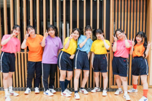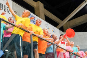 今年度の体育祭は商大堺高校初の大浜だいしんアリーナでの実施になりました。天候や熱中症の心配もなく、生徒たちは大いに盛り上がり会場は熱気に包まれました。また、保護者のみなさまも384組約700名が会場に足を運ばれ、観覧席から生徒たちに声援を送ってくださいました。各団ごとに色分け・デザインされたTシャツを着て競技に打ち込む生徒の姿は、学年やコースの垣根を越えた一体感を強く感じさせてくれました。