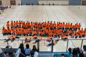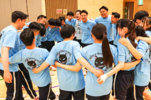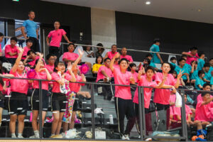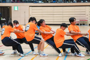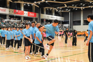 今年度の体育祭は商大堺高校初の大浜だいしんアリーナでの実施になりました。天候や熱中症の心配もなく、生徒たちは大いに盛り上がり会場は熱気に包まれました。また、保護者のみなさまも384組約700名が会場に足を運ばれ、観覧席から生徒たちに声援を送ってくださいました。各団ごとに色分け・デザインされたTシャツを着て競技に打ち込む生徒の姿は、学年やコースの垣根を越えた一体感を強く感じさせてくれました。