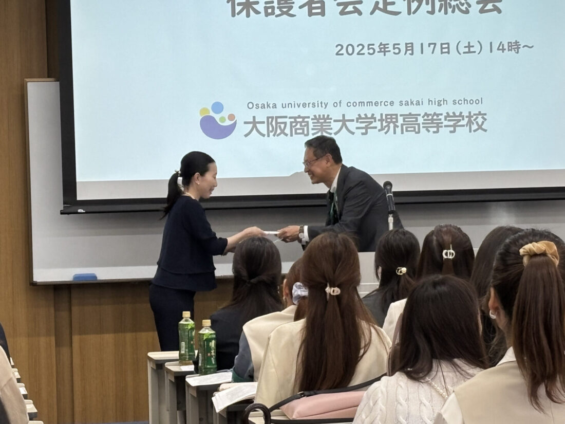 総会の終了後、旧役員を代表して宮本朋美会長に校長から感謝状と記念品が贈呈されました。そして、お仕事の都合で出席できなかった中塚華奈顧問からのメッセージを代読していただきました。中塚顧問、4年間本当にありがとうございました。