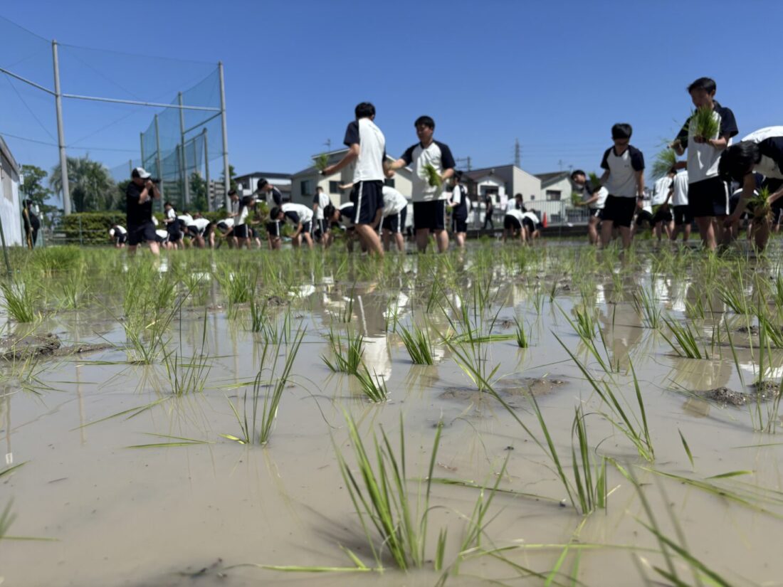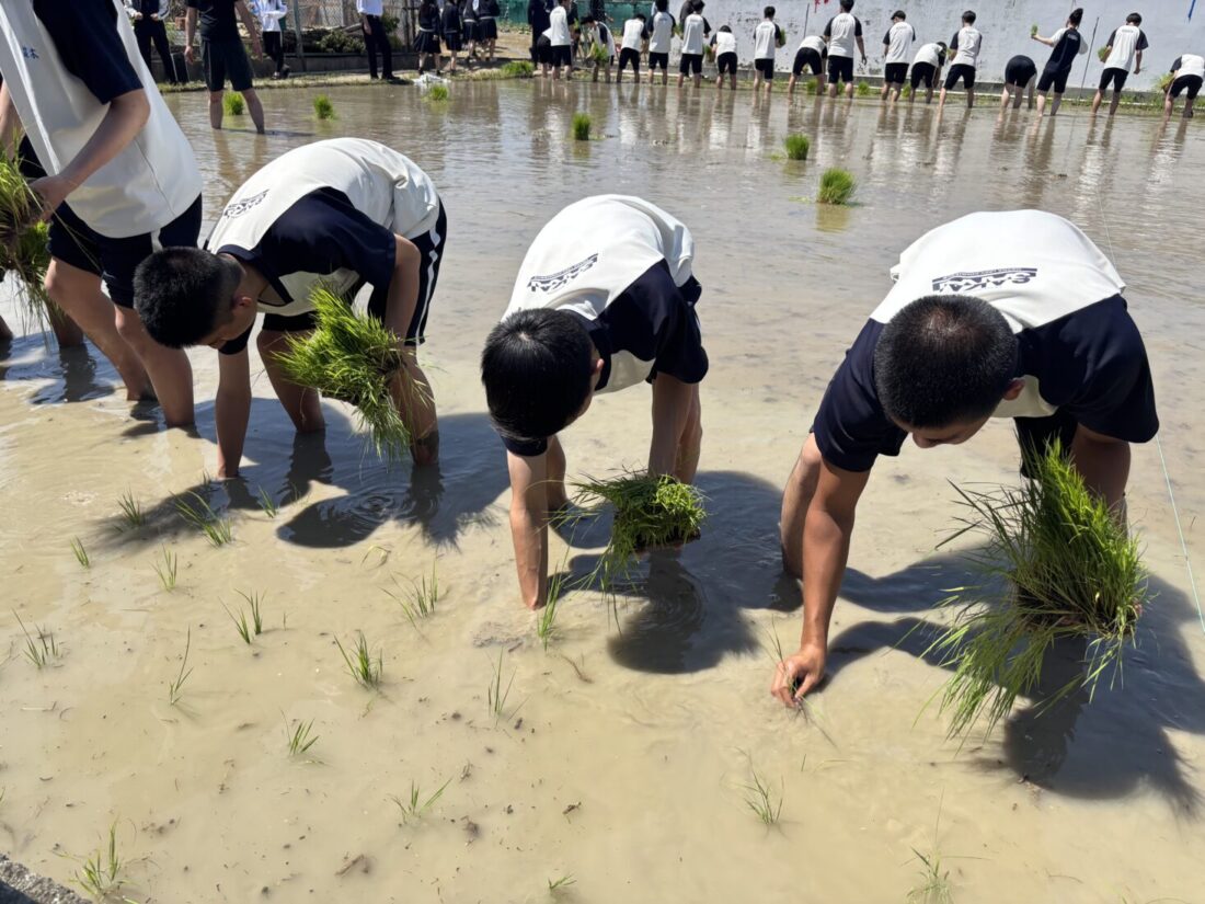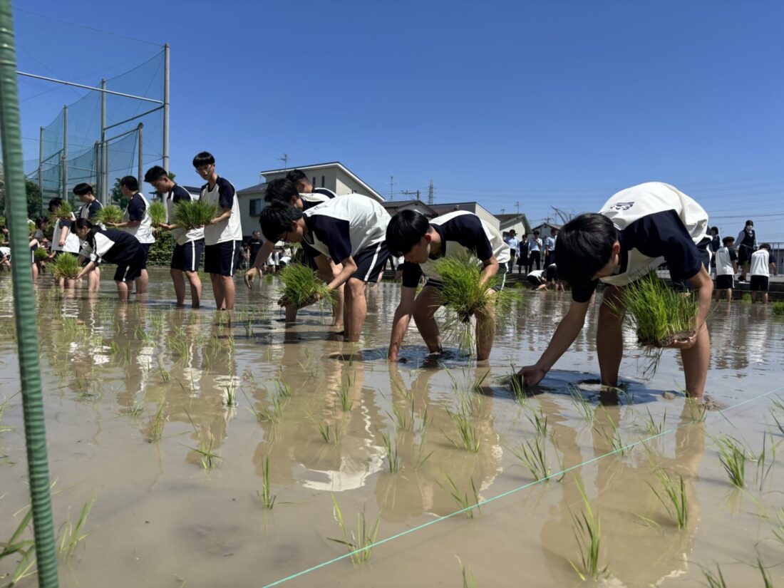 6月5日、青空の下、2年生が学校の田んぼで田植えをしました。
